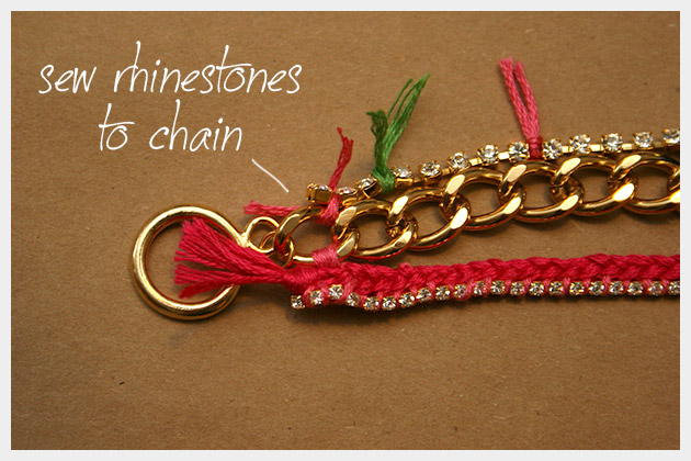 Measure your chain or count the stones on your rhinestone trim and add your embroidery thread tassels at equal distances from each other.