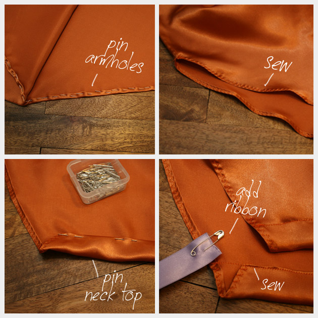 Roll and pin your seams along your armholes. I folded mine over twice to avoid and raw edges that might fray.