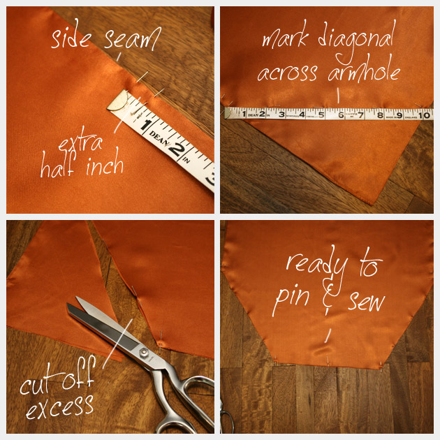 Mark and cut your pillowcase at an angle from the bottom of the armhole to sides of your neckline.