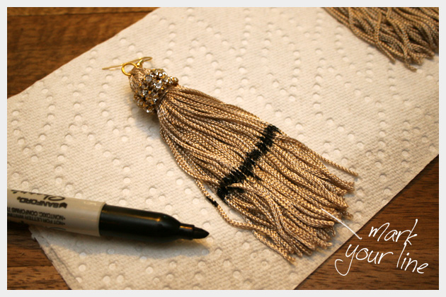 Working on top of a paper towel (I recommend using the paper towel at least doubled), take your sharpie and your tassels and color the bottom half of your tassels.